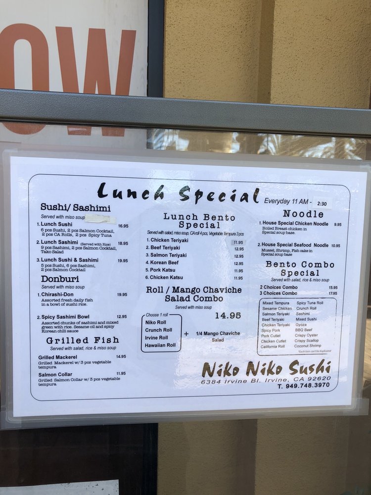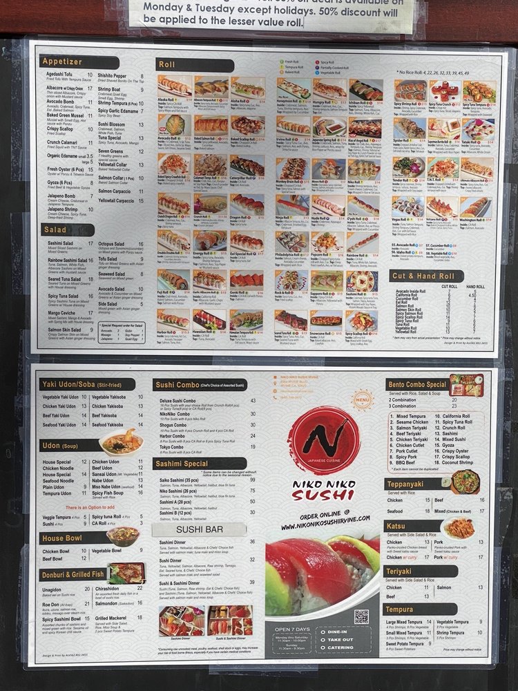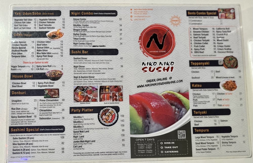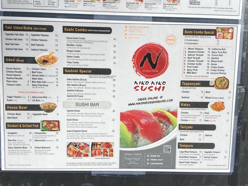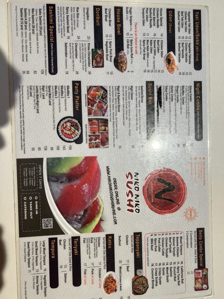 Niko Niko Sushi is a popular spot in Irvine, CA known for its clean, dependable service and nice combination rolls. With a variety of vegetarian options, it caters to a wide range of dietary preferences. Customers rave about the quality and freshness of the food, particularly highlighting dishes like the garlic albacore roll, udon, and chicken teriyaki bowl. The karaage spin on Korean BBQ chicken is also a standout dish worth trying. The sushi rolls are a must-try here, with options like the garlic albacore roll and the salmon and avocado roll topped with sriracha. The restaurant offers a casual and welcoming atmosphere with attentive customer service. Whether you're a sushi lover or looking to try something new, Niko Niko Sushi is a hidden treasure that won't disappoint.